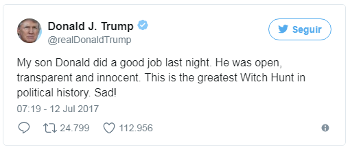 En casa de los Trump todo sigue igual. El hijo mayor del presidente de EEUU es “inocente, transparente, abierto” y la investigación por su reunión con una supuesta enviada del Kremlin supone “la mayor caza de brujas de la historia política”. No hay más vueltas. Antes de volar a París, Donald Trump dejó clara su doctrina ante los republicanos y volvió a intentar pasar página a un escándalo que cada día fractura más al país.