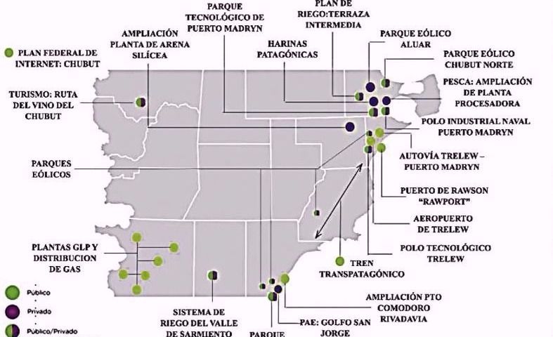 También aparecen la autovía Trelew-Madryn; el Polo Industrial Naval de Puerto Madryn; el Plan de Riego de la Terraza Intermedia; el Puerto de Rawson Rawport; el Polo Tecnológico de Trelew y Madryn; la Ruta del Vino del Chubut; el Plan Federal de Internet; la ampliación de la Planta de arenas silíceas; Harinas Patagónicas; la ampliación de la Planta Procesadora de Pesca; la ampliación del Puerto de Comodoro Rivadavia; el Sistema de Riego del Valle de Sarmiento; y los parques eólicos de YPF, el Kosten, Loma Blanca, Diadema, Garayalde y el Chubut Norte; entre otros.