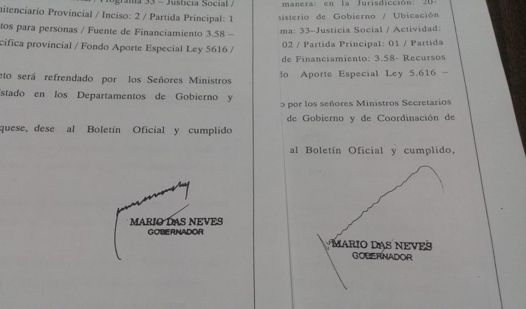 Las firmas que acompañan este texto son (supuestamente) del gobernador Mario Das Neves y corresponden a dos decretos distintos: El 849 del 22 de Junio del 2017 y el 858 fechado el 29 de ese mismo mes y año, es decir con una diferencia de apenas siete días entre ambos.