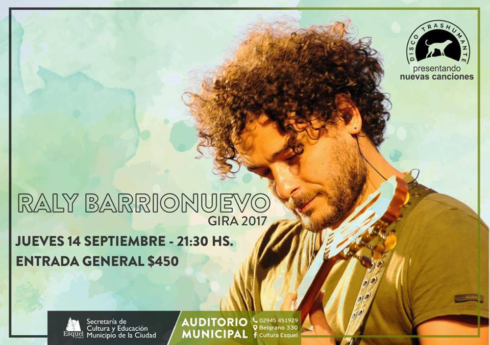 El artista santiagueño Raly Barrionuevo estará el próximo 14 de Septiembre presentándose a las 21.30 horas en el Auditorio Municipal en el marco de la Gira Patagónica 2017.
