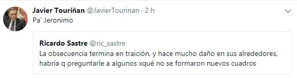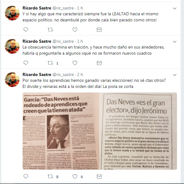 “La obsecuencia termina en traición, y hace mucho daño en sus alrededores, habría q preguntarle a algunos xqué no se formaron nuevos cuadros”, agregó Sastre, siempre por la red social del pajarito azul. Y siguió: “Y si hay algo que me caracterizó siempre fue la LEALTAD hacia el mismo espacio político, no deambulé por donde caía bien parado como otros!”