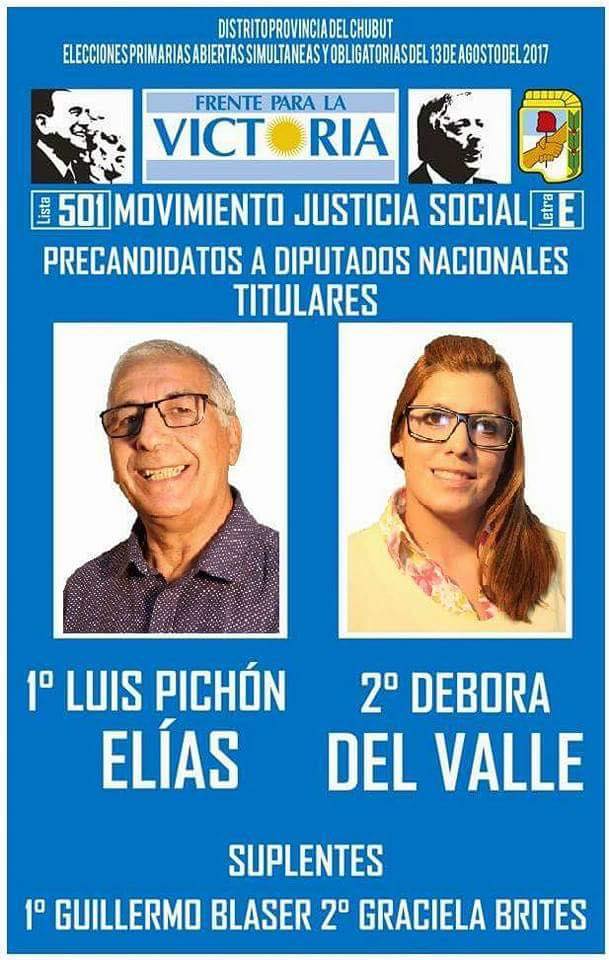 El Movimiento Justicia Social Chubut lleva de candidatos a Diputados Nacionales a Luis «Pichón» Elías y a Débora Del Valle en la lista del PJ 501 E decidieron desenmascarar a Montes.