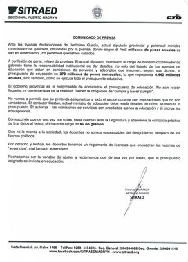 Rechazamos ser la variable de ajuste, y reclamamos que de una vez por todas, que el presupuesto asignado se invierta en educación.
