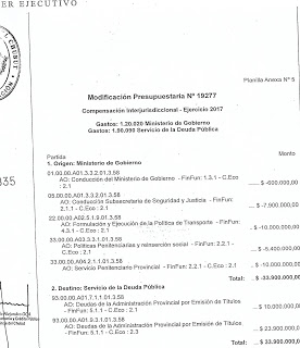 Formulación y Ejecución de Políticas de Transporte, -$10.000.000 (esta es la causa por la cual se ha afectado el Programa de los Boletos del Transporte Estudiantil Gratuito, TEG,); Políticas Penitenciaria y reinserción social: -$5.400.000; Servicio Penitenciario Provincial -$10.000.000; Seguridad y Justicia: – $7.900.000; Ministerio de Gobierno: $600.000. Total 33.900.000.