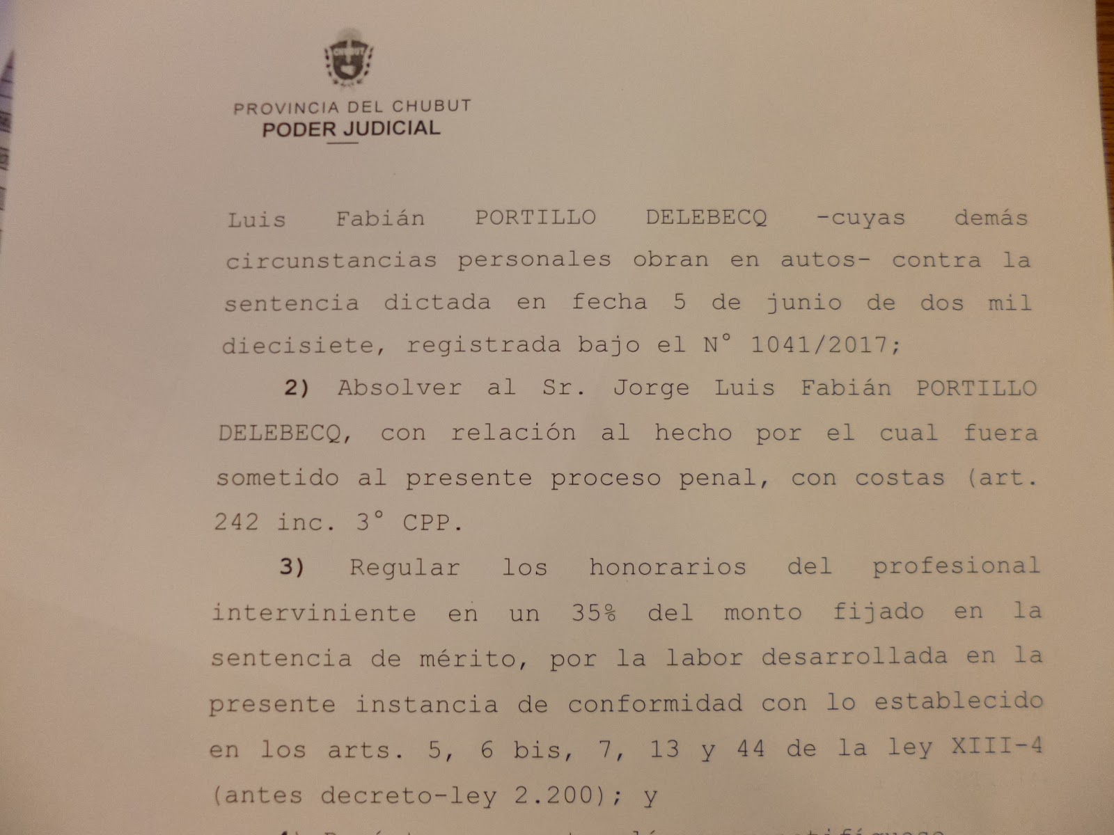 Los jueces Mónica Rodríguez, Roberto Adrián Barrios y Alejandro Gustavo Defranco, hicieron lugar a la impugnación presentada por la defensa y resolvieron absolver a Jorge Luis Fabián Portillo Delebecq. Portillo había sido condenado a la pena de dos años y seis meses de prisión de ejecución condicional, más la pena de inhabilitación perpetua para ejercer cargos públicos en cualquier dependencia de Obras Públicas como coautor del delito de Defraudación contra la Administración Pública por los hechos ocurridos en El Maitén y en Esquel entre el 16 de mayo de 2014 y el 30 de diciembre de 2014, en perjuicio de la administración pública provincial.