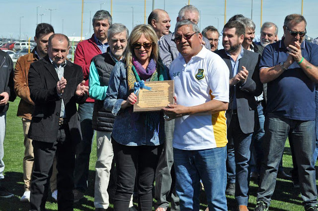 El agradecimiento a Artero fue por medio de una placa que le fue entregada durante la ceremonia, realizada este sábado en la cancha del club que, de esta manera, tuvo un histórico logro para el que el municipio colaboró con el aporte de maquinaria y personal para ayudar a la instalación, lo que se sumó a los aportes de distinto tipo realizados desde el inicio de la primera gestión de la Intendenta, hace seis años.