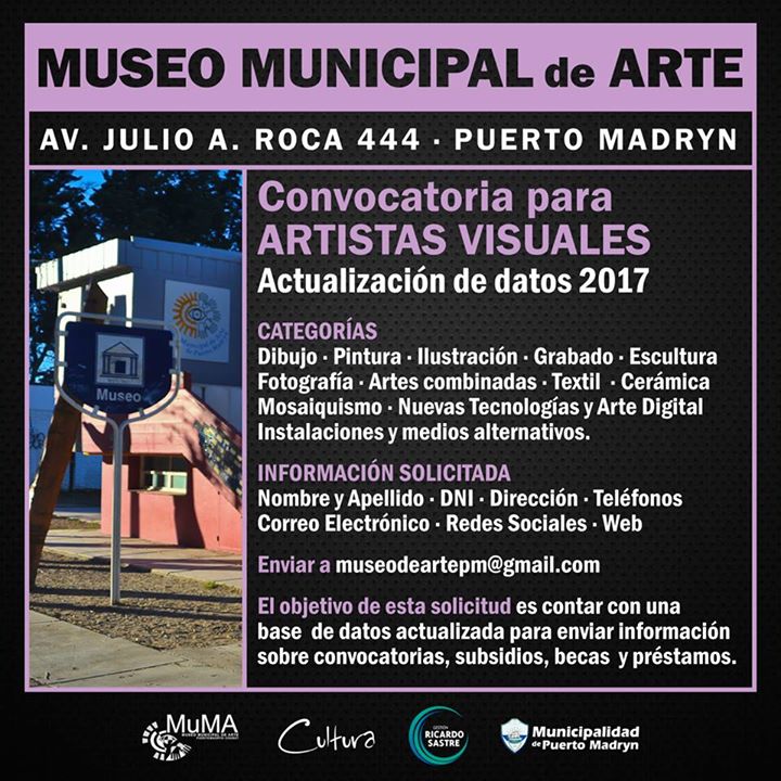 El objetivo de esta solicitud es contar con una base de datos actualizada que permitirá el envío de información sobre convocatorias, subsidios, becas, préstamos y otras novedades a nivel local, regional y nacional. Aquellos nacidos y/o residentes en la localidad de Puerto Madryn podrán contactarse vía mail a museodeartepm@gmail.
