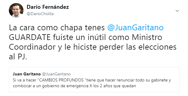 A este tuit Darío Fernández respondio: «La cara como chapa tenes @JuanGaritano GUARDATE fuiste un inútil como Ministro Coordinador y le hiciste perder las elecciones al PJ.