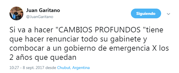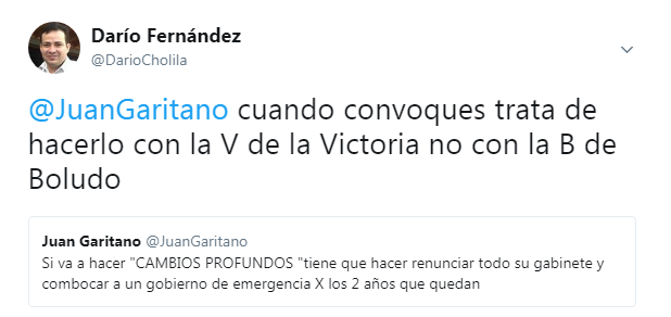 El mismo dice: «Si va a hacer «CAMBIOS PROFUNDOS» tiene que hacer renunciar todo su gabinete y combocar a un gobierno de emergencia X los 2 años que quedan a lo que el comunicador social de Cholila Online con el humor que lo caracteriza le respondió: «@JuanGaritano cuando convoques trata de hacerlo con la V de la Victoria no con la B de Boludo».
