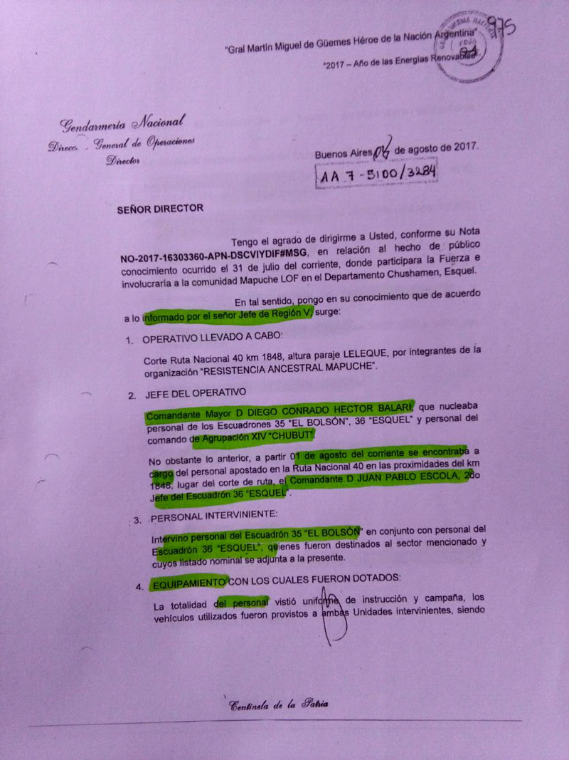 5. La Gendarmería lo dejó por escrito: “El 31 de julio del corriente año a las 22 horas, el jefe del operativo Comandante Mayor Diego Conrado Héctor Balari, tomó contacto telefónico con el señor ministro de Gobierno de la provincia de Chubut, Pablo Durán, quien en horas de la mañana había participado de la reunión de coordinación mantenida con el señor jefe de Gabinete del Ministerio de Seguridad, doctor Pablo Noceti, en la ciudad de San Carlos de Bariloche (RN), quien se comprometió a ordenar a personal de la policía de esa provincia a colaborar con la Fuerza, lo cual no se concretó pese a los reiterados llamados telefónicos al señor Jefe de la Policía de Chubut y segundo jefe de la Unidad Regional de Esquel”.