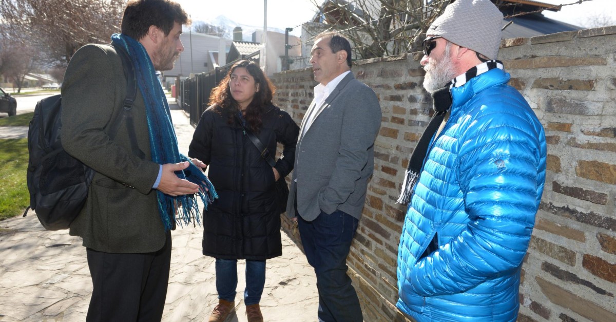 El Director del CELS, Gastón Chillier, Andrea Antico, cuñada de Santiago Maldonado, Sergio Maldonado, hermano, y el Secretario de la Defensoría Oficial, Alejandro Savino, ayer en Esquel, donde declararon nuevos testigos en el Juzgado Federal, en el marco de la causa por la desaparición del joven artesano.