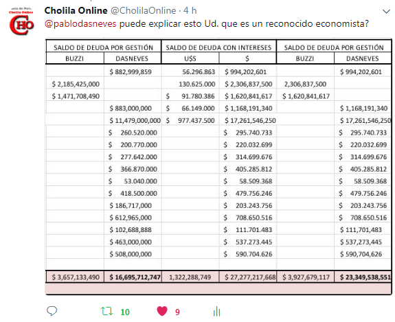 Pasaron ya 4 horas desde que Cholila Online le pidió al hijo del Gobernador Mario Das Neves que explique la deuda que generó su padre junto a Martin Buzzu el «delfín» que puso Das Neves de Gobernador en 2011 y que sacó en 2015 bajo la célebre frase: «Yo te puse yo te sacó».