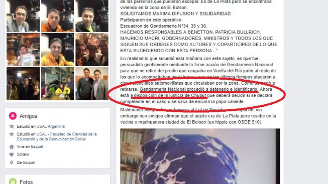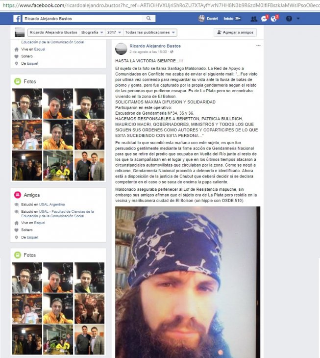 En su muro de Facebook Bustos dijo que “este sujeto” (por Maldonado) efectivamente estaba en la Lof, que “fue persuadido gentilmente mediante la firme acción de Gendarmería Nacional para que se retire del predio” y que “como se negó a retirarse, Gendarmería Nacional procedió a detenerlo e identificarlo”.