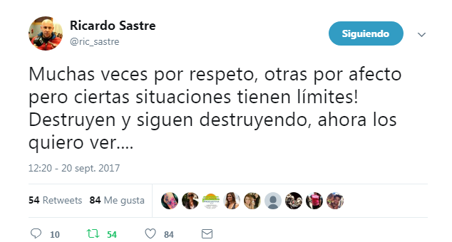 El intendente de Puerto Madryn, Ricardo Sastre, arremetió contra el entorno más cercano del gobernador, Mario Das Neves, poniendo en evidencia una vez más las fuertes internas que hay en el Gobierno. El tuit fue contundente: “destruyen y siguen destruyendo”, escribió el jefe comunal. Si bien no los nombró, el mensaje está dirigido principalmente a los hijos de Mario das Neves, Pablo y María Victoria.
