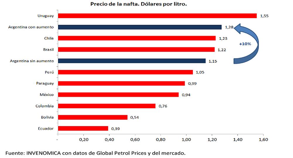 Con la aplicación del ajuste de alrededor del 10% en los precios de los combustibles al público, la nafta pasará de costar 1,15 dólares por litro promedio a 1,28 dólares. «El precio de la nafta en la Argentina superará al de Chile y de Brasil, y se ubicará segunda en América Latina después de Uruguay», estimó el director de la firma, Pablo Besmedrisnik. «Todo esto se da en el marco de la voluntad del Gobierno de reducir su nivel de intervención en la determinación de precios de los combustibles», aclaró el economista.