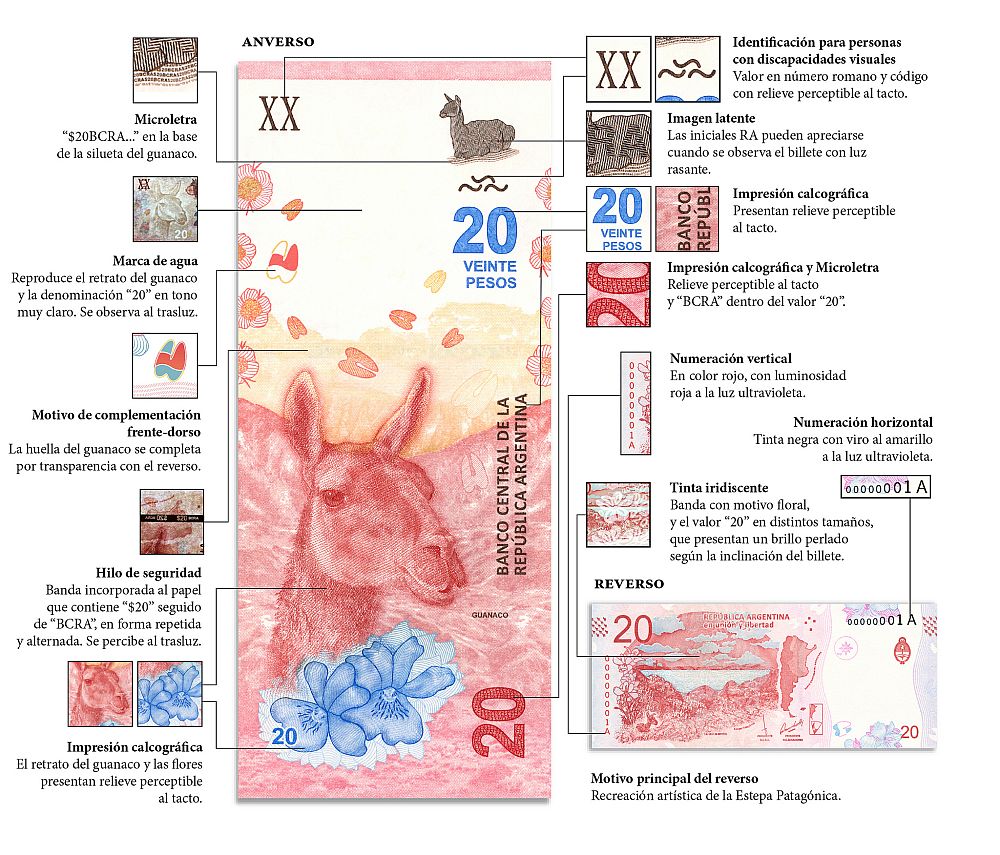 Entre otras medidas de seguridad, se destacan la marca de agua, que reproduce el retrato del guanaco y la denominación «20» en tono muy claro, la impresión calcográfica, con un relieve perceptible al tacto, y el hilo de seguridad, banda incorporada al papel que contiene la leyenda «$20» seguido de «BCRA», en forma repetida y alternada.