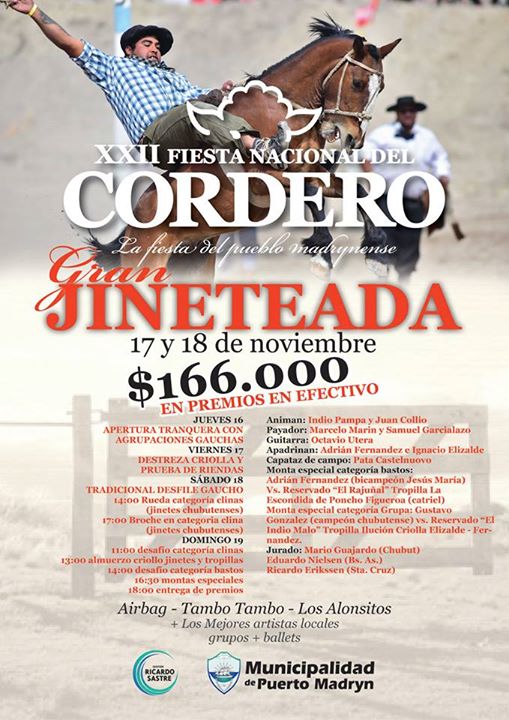 Además la jinetada contará con más de 160 mil pesos en premios Avanzan los preparativos para la XXII edición de la Fiesta Nacional del Cordero en distintos ámbitos, especialmente en lo que atañe al Campo de Jineteada, presentación de Agrupaciones Gauchas de la ciudad y Desfile Gaucho. Este año, por primera vez, se llevará a cabo el concurso del «Mejor Emprendado» en el que se premiará a aquellos jinetes que muestren las mejores presentaciones tanto de caballo como de monta en dos categorías, Mayores de 15 años y Menores.