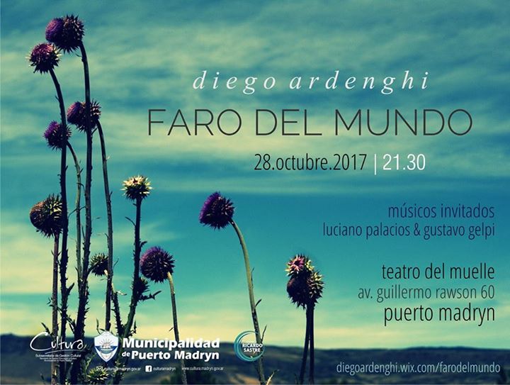 El trabajo se denomina “Faro del Mundo” y se podrá disfrutar en el show del sábado 28 de octubre a las 21.30 La Subsecretaría de Gestión Cultural de la Municipalidad de Puerto Madryn invita al recital de Diego Ardenghi, músico que presentará su primer trabajo discográfico “Faro del Mundo”.