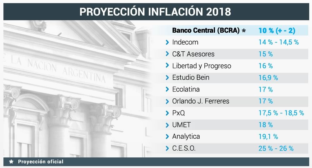 Si bien el presidente del Banco Central (BCRA), Federico Sturzenegger, aseguró en el último Informe de Política Monetaria que «el proceso de desinflación sigue», especialistas proyectan una inflación para 2018 entre el 14% y el 19%, por encima de la meta del 8%-12% planteada por la entidad monetaria. En todos los casos, dan cuenta de una composición de la inflación anclada en un aumento de tarifas encabezado por energía y transporte.