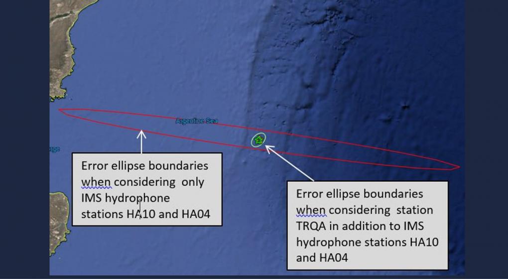 «Mejora de ubicación más confiable del #ARASanJuan: análisis actualizado utilizando dos estaciones sísimicas a distancias (TRQA-Tornquist, Argentina, IRIS/USGS & EFI Mount Kent, al este de las Islas Malvinas), que pueden haber registrado señales asociadas a las de las estaciones hidroacústicas», dice su tuit.