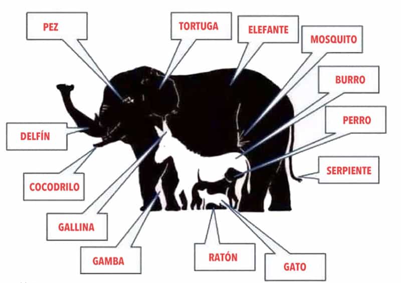 La cifra más común es ver los cinco animales más evidentes y conocidos: un elefante, un burro, un perro, un gato y un ratón.