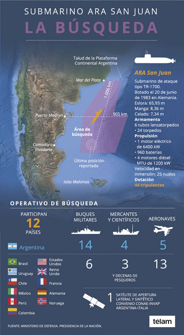 Desde el puerto de la ciudad patagónica arrancaron las tareas que realiza la Armada Argentina, en conjunto con tropas norteamericanas, en la búsqueda de los 44 tripulantes del submarino argentino. Dos barcos, un vehículo controlado por control remoto en superficie y un mini submarino, estarán abocados a los trabajos de rescate.