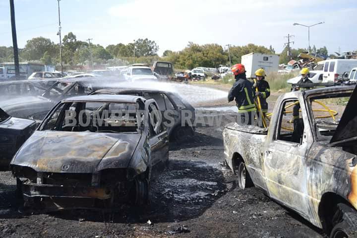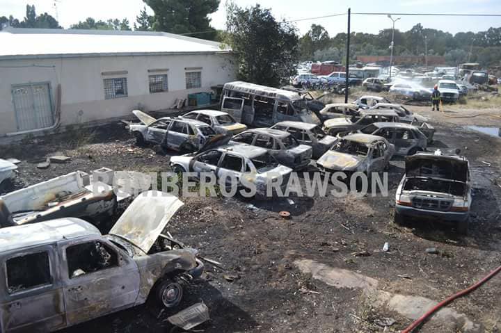 En la tarde de hoy, personal del cuartel de Bomberos de Rawson debió combatir por casi dos (2) horas, un siniestro de grandes dimensiones en automotores de la Policía de la Provincia, en cercanías del ex zoológico en el ingreso a la capital por Ruta Provincial N° 25.