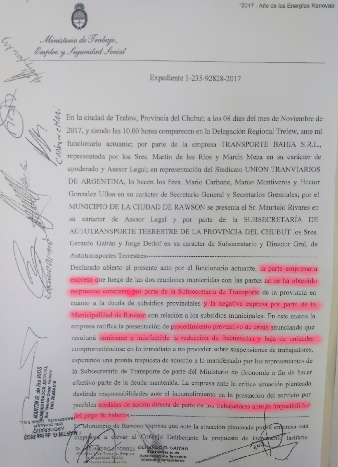Debido al fracaso en las 2 audiencias de conciliación realizadas en la Delegación Trelew del Ministerio de Trabajo de Nación entre la empresa Transporte Bahia S.R.L. y Municipalidad de Rawson con la Subsecretaria de Transporte provincial el personal de la empresa mencionada se encuentra en alerta y estarían realizando una medida de retención de servicios a partir de las próximas horas de hoy miércoles 8 de Noviembre por tiempo indeterminado.