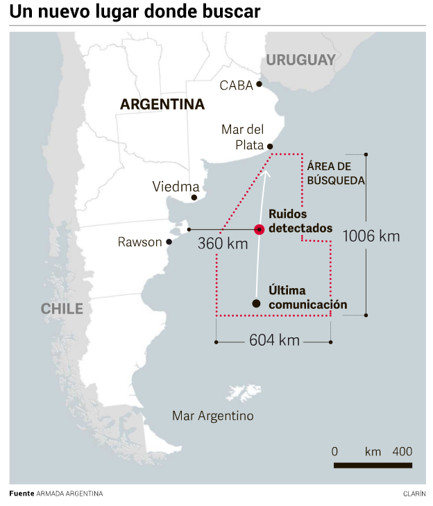 Tal como puede verse en el mapa, tomando el punto de la última comunicación efectuada por el ARA San Juan y el punto donde se detectaron los ruidos puede trazarse una línea recta hasta Mar del Plata, lugar hacia donde estaba previsto que se dirigiera el submarino.