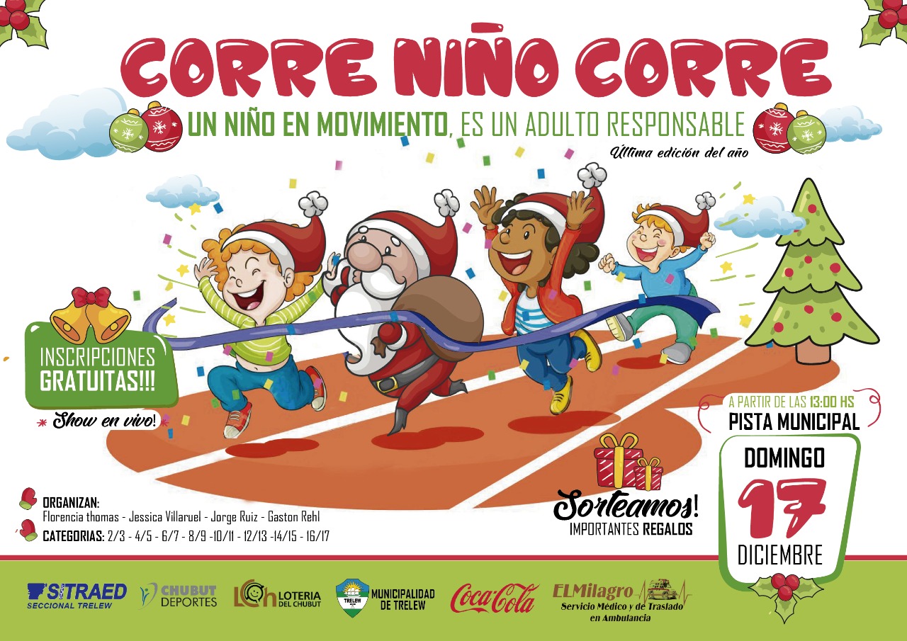 La prueba atlética para niños y jóvenes de 3 a 17 años de edad, cuenta con la organización de Gastón Rehl, Jorge Ruíz y Jéssica Villarroel y el auspicio de la Municipalidad de Trelew.