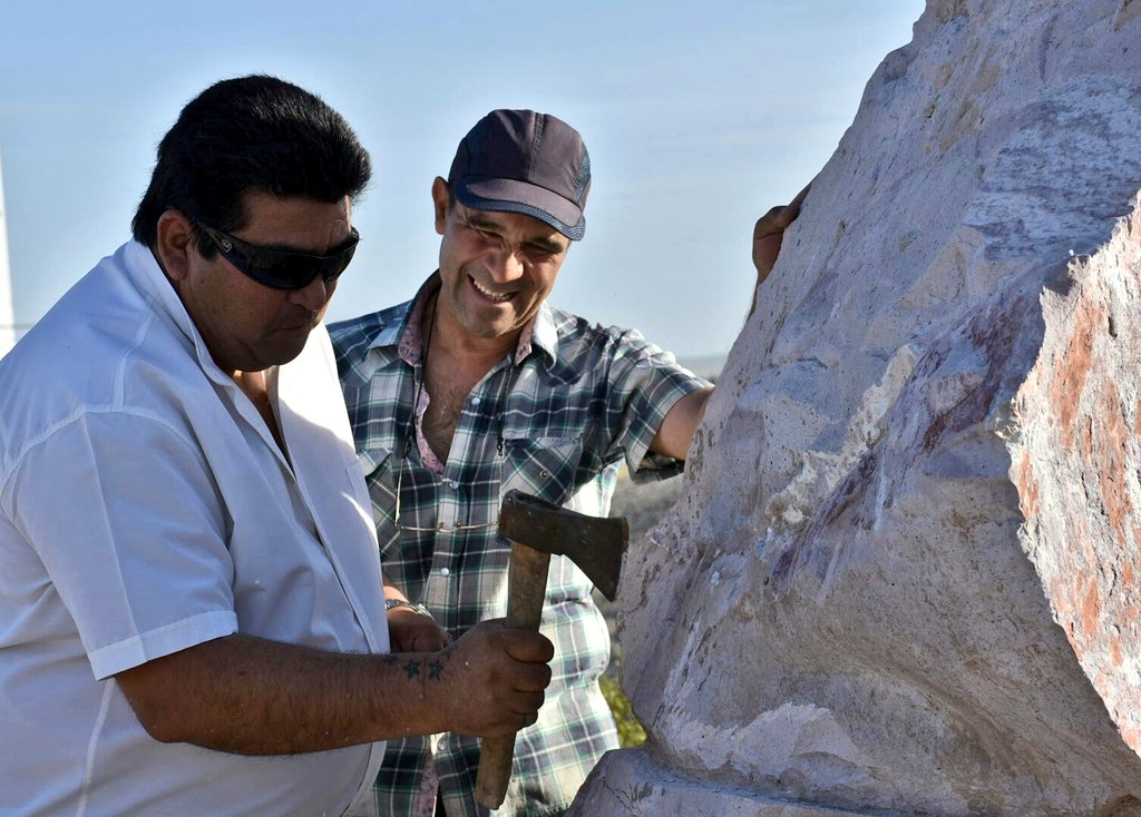 El escultor chubutense Milton Frintt, que esta tarde comenzó los trabajos sobre esta piedra que se extrajo desde la cantera de Las Plumas, señaló que “para nosotros es una emoción muy grande poder realizar este trabajo escultórico en un lugar que es sagrado para los pueblos originarios”.