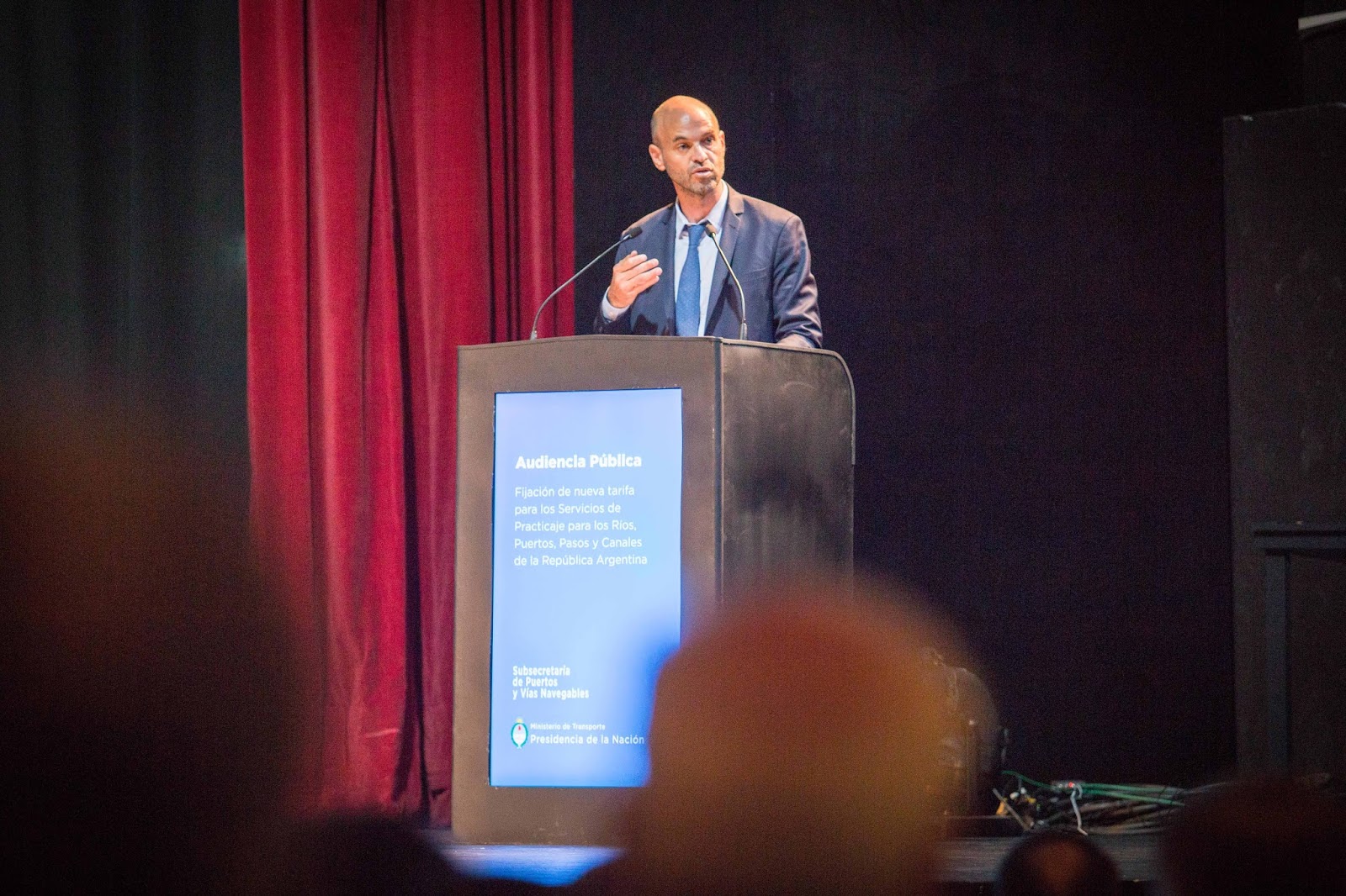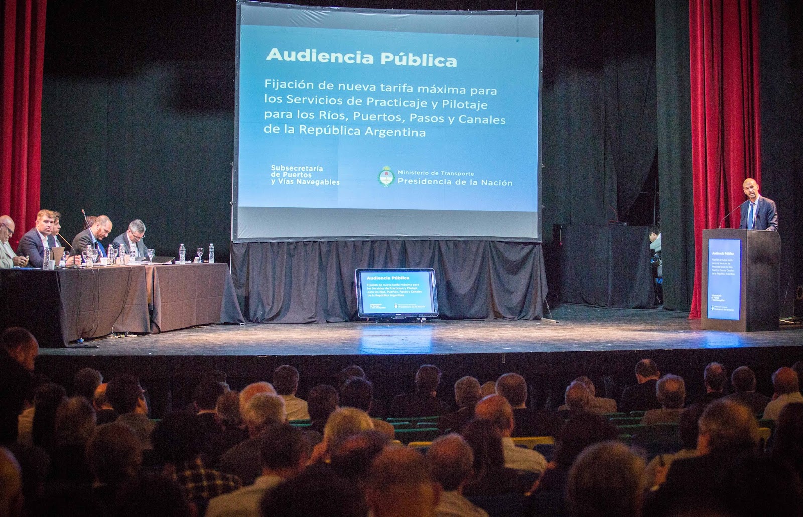 Buenos Aires, 12 de diciembre de 2017.- El Teatro de la Ribera, en el barrio de La Boca de la Ciudad de Buenos Aires, fue nuevamente escenario de una audiencia pública del Ministerio de Transporte. Esta vez, para bajar en un 30% las tarifas del servicio de practicaje, cuya autoridad de aplicación es la Subsecretaría de Puertos y Vias Navegables, y que comprende un servicio obligatorio en los principales puertos del país, público y fundamental para la seguridad de la navegación. La apertura estuvo a cargo del ministerio de Transporte de la Nación, Guillermo Dietrich. Participaron casi 50 oradores, entre ellos representantes de las administraciones de seis provincias a favor de limitar el costo del servicio para fomentar la competitividad de las economías regionales.