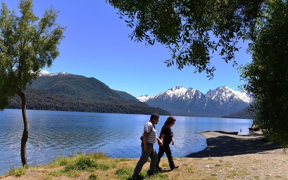 Elena y Gabriel Peralta, una pareja de cordobeses que recorren la Patagonia y ayer viajaban hacia Neuquén, pararon ayer al mediodía en la playa del Mascardi, con la intención de llevarse una buena cantidad de fotos del lago, el bosque y las cumbres nevadas.