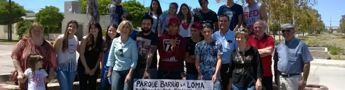 El intendente municipal, Mariano García Aranibar, junto al director de la Juventud, Jonatan González y estudiantes del Colegio Camwy inauguró ayer la Plaza del Barrio La loma con juegos realizados con materiales reciclados y forestada por los mismos estudiantes.