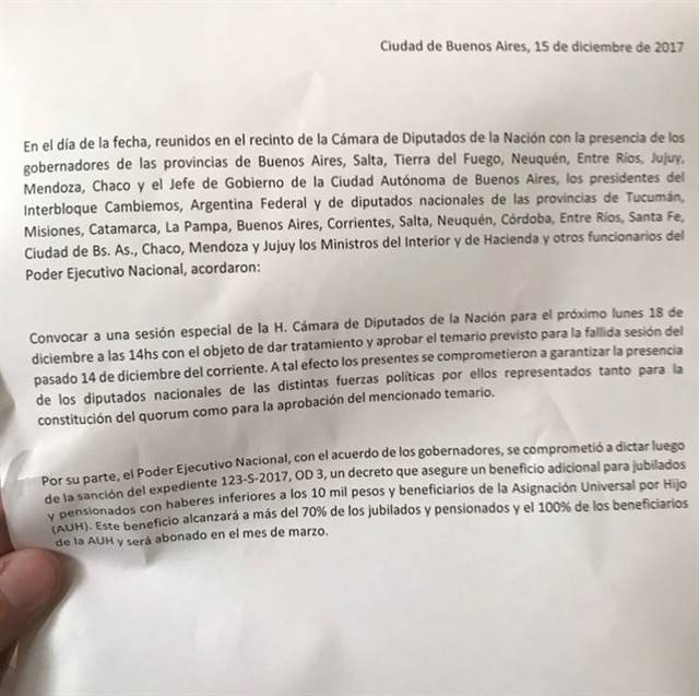 «La idea era resolver la cuestión de la reforma previsional y hemos podido lograr un acuerdo, que consiste en la generación de un bono adicional para los jubilados y los beneficiarios de la AUH y también para los que han podido lograr el beneficio de la movilidad jubilatoria», detalló Kosiner.