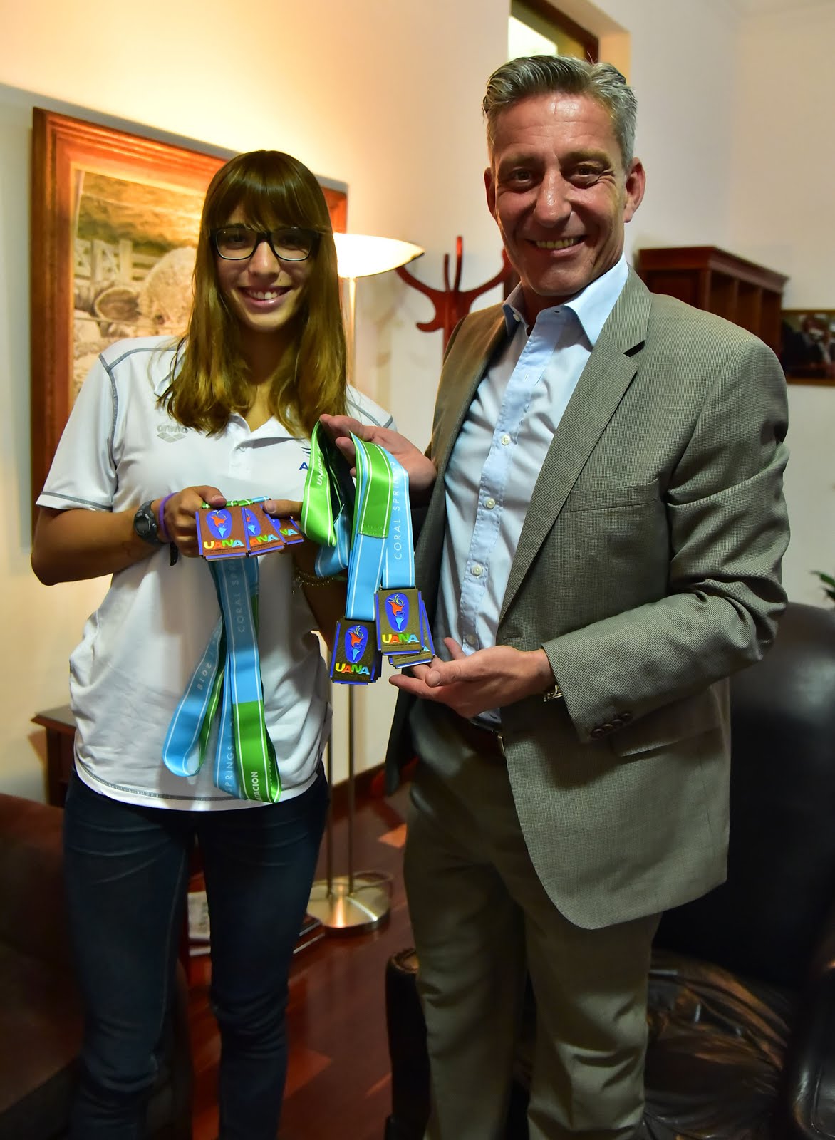 El gobernador del Chubut, Mariano Arcioni, recibió este jueves por la tarde en su despacho de la Casa de Gobierno a la nadadora chubutense, Julieta Lema, quien regresó a la provincia luego de su contundente performance en Florida, Estados Unidos, donde obtuvo siete medallas, (cinco de oro y dos de bronce), en la Copa UANA 2018, con la Selección Argentina de Natación.