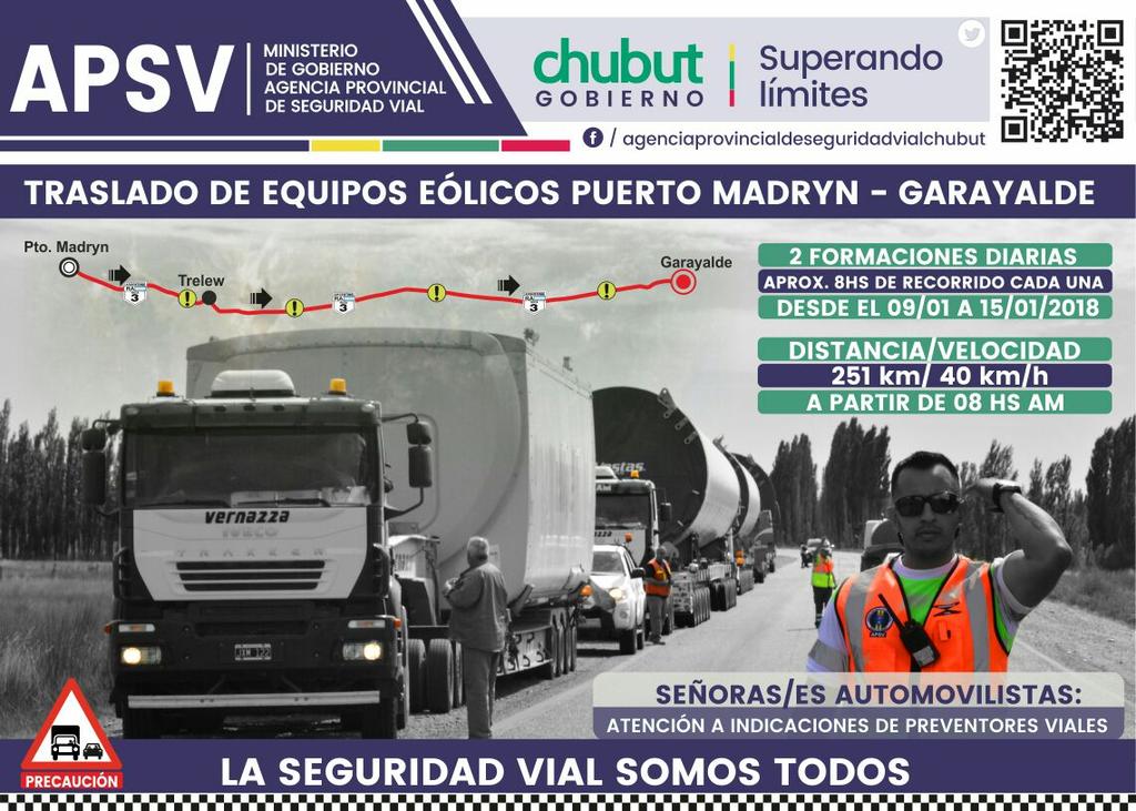El operativo de traslado de las partes constitutivas de molinos eólicos desde la ciudad de Puerto Madryn hasta Garayalde, comenzó el pasado martes y se extenderá hasta este lunes inclusive. A diario, parten desde la ciudad del Golfo un convoy de 4 camiones por Ruta Nacional Nº 3 a las 8 y 10 horas, finalizando el recorrido cerca de las 20 horas en destino.