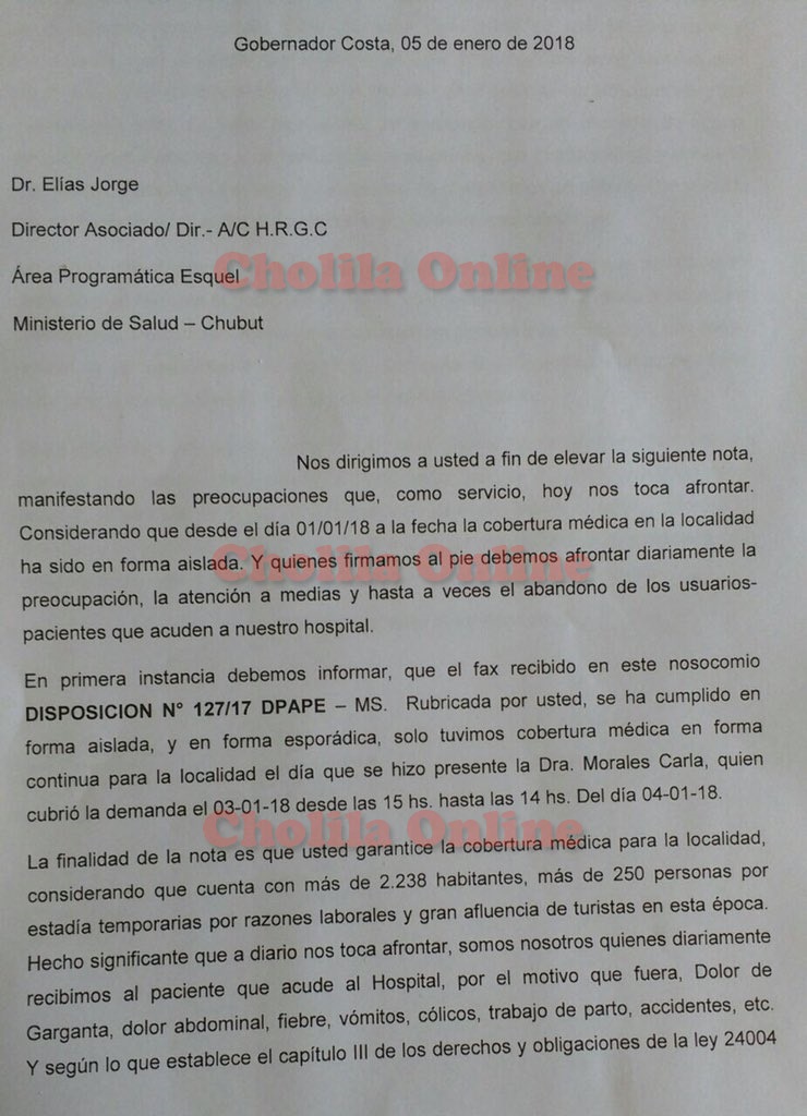 Hace poco más de un año no hay director, estamos a cargo del área programática de Esquel q vienen una vez cada dos meses, y hace un mes se jubiló la administradora, quieren dejar a una joven qUE en mayo de 2016 entró a trabajar al hospital de “ñoqui” (la premiaron por ser concejal del ChuSoTo), pero como no se encuentra en planta permanente no puede acceder al cargo, ante esta situación desde el APE decidieron que la administración del hospital de Gobernador Costa esté a cargo del hospital de San Martín. No hay médico, enfermería siempre poniendo la cara, es una vergüenza