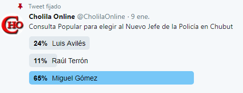 El comisario mayor Miguel Gómez será el nuevo jefe de la Policía de Chubut y asumiría mañana. La tendencia era irreversible, las encuestas en Cholila Online mostraban como la sociedad pedía a gritos un policía preparado y especializado que esté a la altura de la circunstancia, así se podía observar en los comentarios de los vecinos de Chubut al Portal de Noticias Cholila Online
