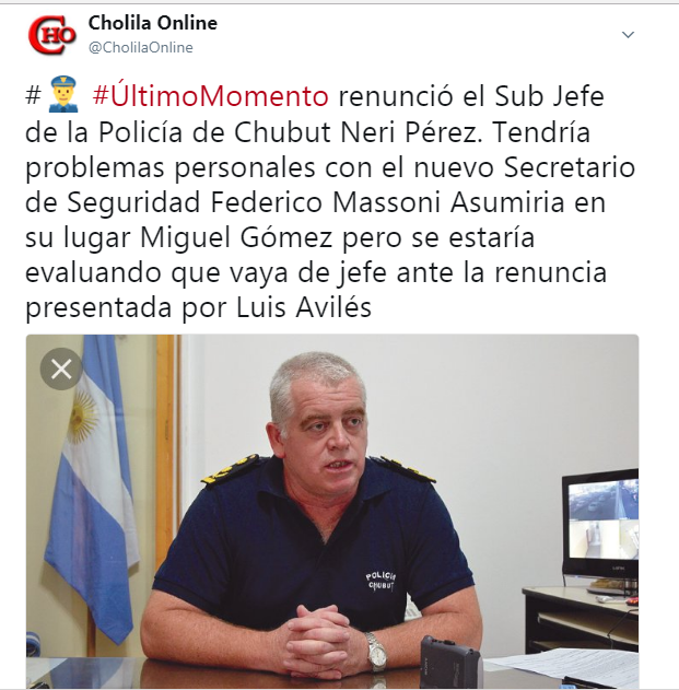 Luego de la asunción del nuevo secretario de Seguridad y Justicia del Chubut, Federico Massoni, hubo una reunión con los jefes policiales a quienes se le plantearon nuevos lineamientos de trabajo, razón por la cual decidieron presentar su renuncia para permitir aire fresco y renovación de gestión. En el caso de Neri Pérez manifestó que estaba un poco cansado y necesitaba dar un paso al costado.