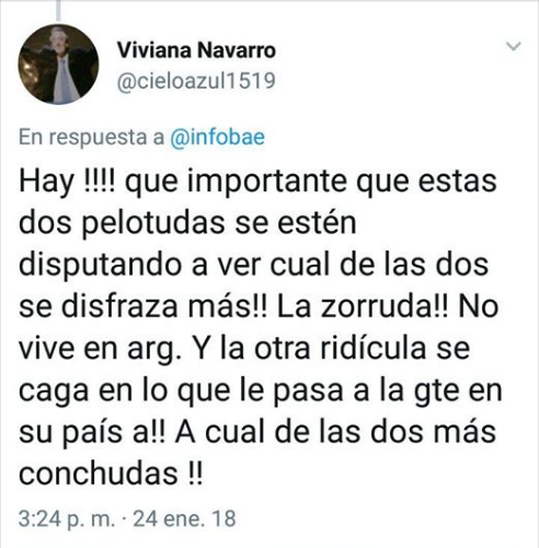 La Negra como se la conoce a Navarro fue repudiada en las redes sociales por escribir desde su cuenta de twitter insultos irreproducibles contra dos mujeres, que más allá de su estado actual en la política, su posición social o económica no dejan de ser seres humanos que merecen ser respetados y en caso de no estar de acuerdo los argumentos deben plantearse dentro del marco y el parámetro de la democracia y convivencia pacífica y no generando violencia, verbal, gráfica, mucho menos siendo una representante de la Legislatura de Chubut.