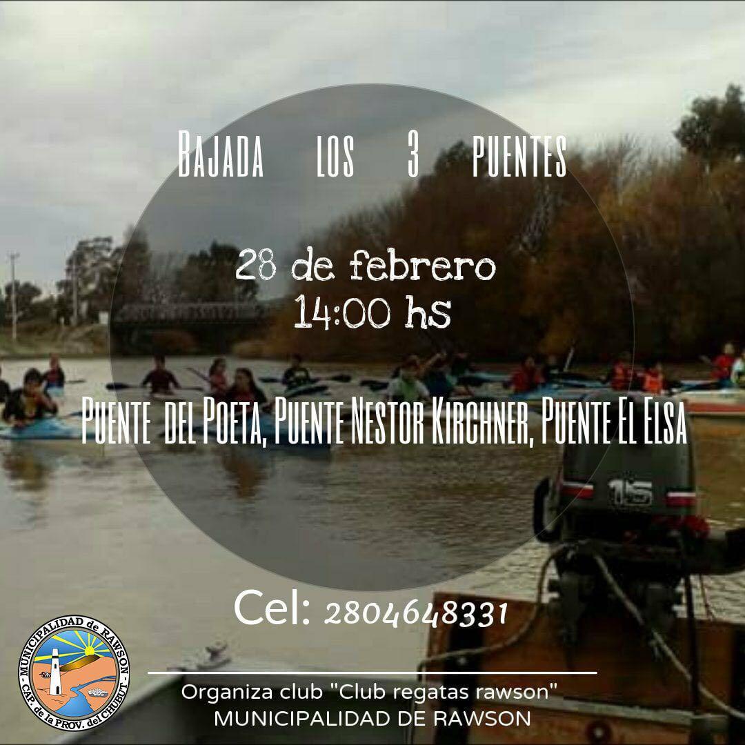 Las clases de canotaje gratuitas impulsadas por la Municipalidad de Rawson en conjunto con el Club de Regatas tendrán su cierre estelar este miércoles desde las 14.00 con la realización de “La Bajada de los 3 Puentes”, una actividad recreativa que atravesará los puentes del Poeta, Néstor Kirchner y El Elsa.