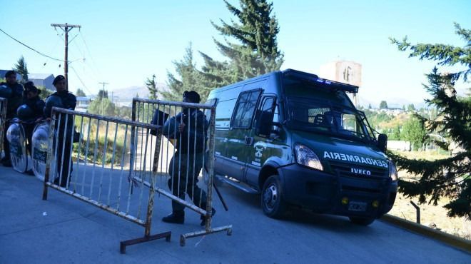Gendarmes y policías de la fuerza provincial cercaron el acceso al gimnasio municipal N°3 donde mañana se realizará el juicio de extradición a Facundo Jones Huala.