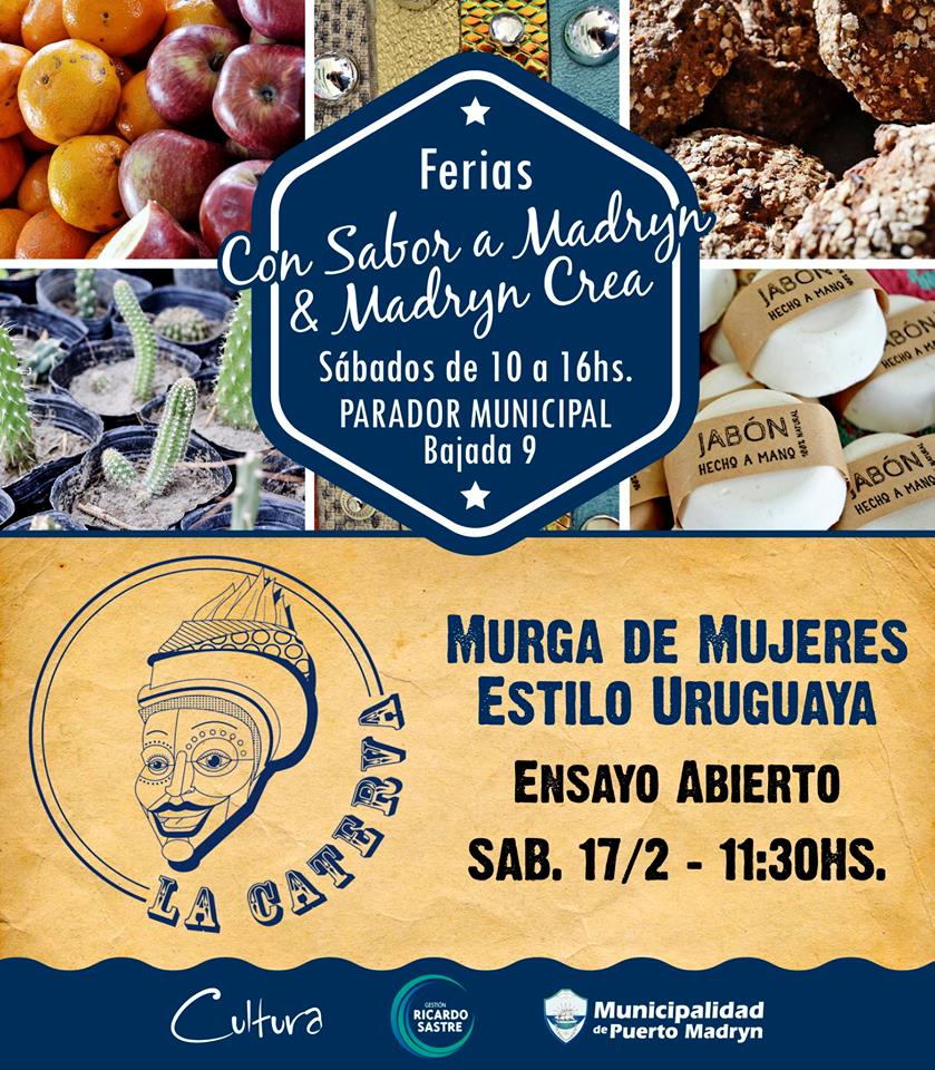 La Subsecretaría de Gestión Cultural de la Municipalidad de Puerto Madryn invita a una Edición Especial de las Ferias “Con Sabor a Madryn y “Madryn Crea”, que se realizará el sábado 17 de febrero de 10 a 16 en el Parador Municipal, Bajada 9.