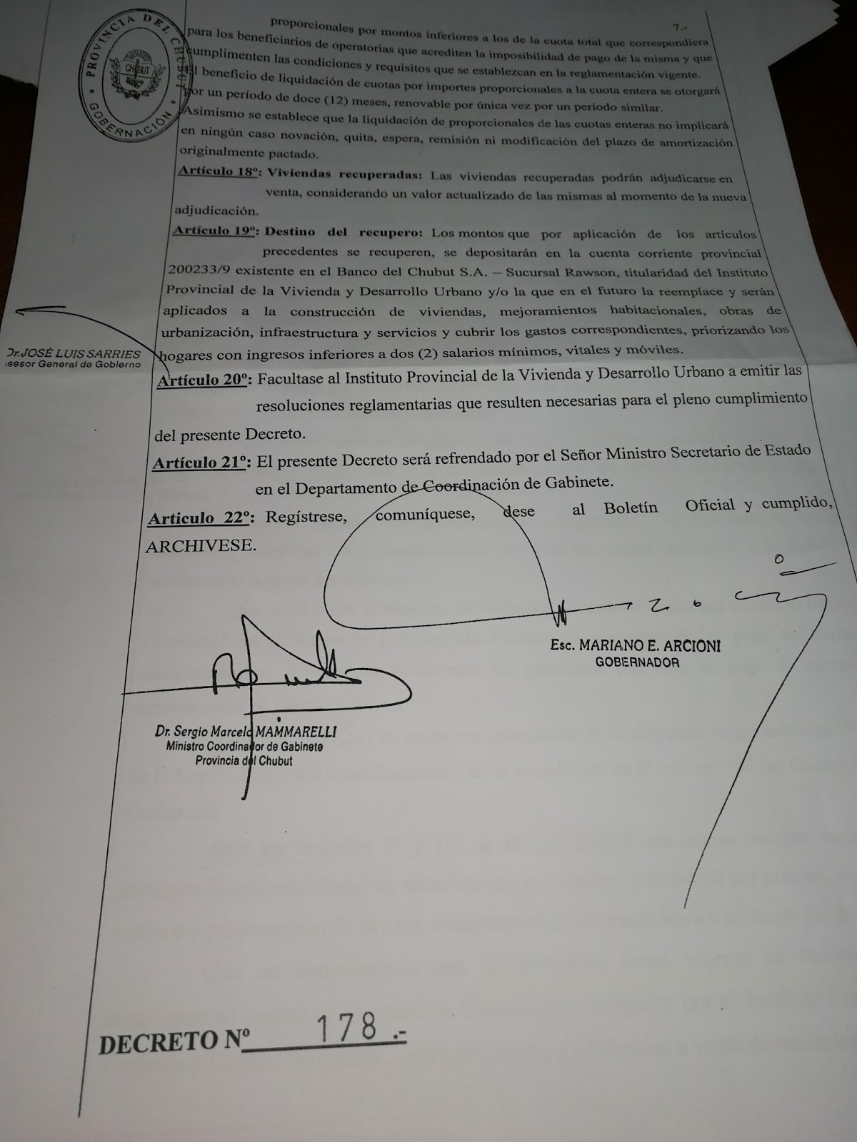El Decreto todavía no aparece el sitio oficial del gobierno, sistemas.chubut.gov.ar/digesto/sistema/consulta.php, ni fue publicado en el Boletín Oficial, y lleva la firma del Esc. Mariano E. Arcioni y del Ministro Coordinador de Gabinete, Dr. Sergio Mammarelli.
