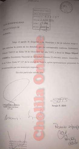¿Quieren pruebas? Como siempre Cholila Online documenta todo con pruebas. Adjuntamos copia digitalizada de la Cesión que Di Filippo –como representante municipal- le firmó a Correa.
