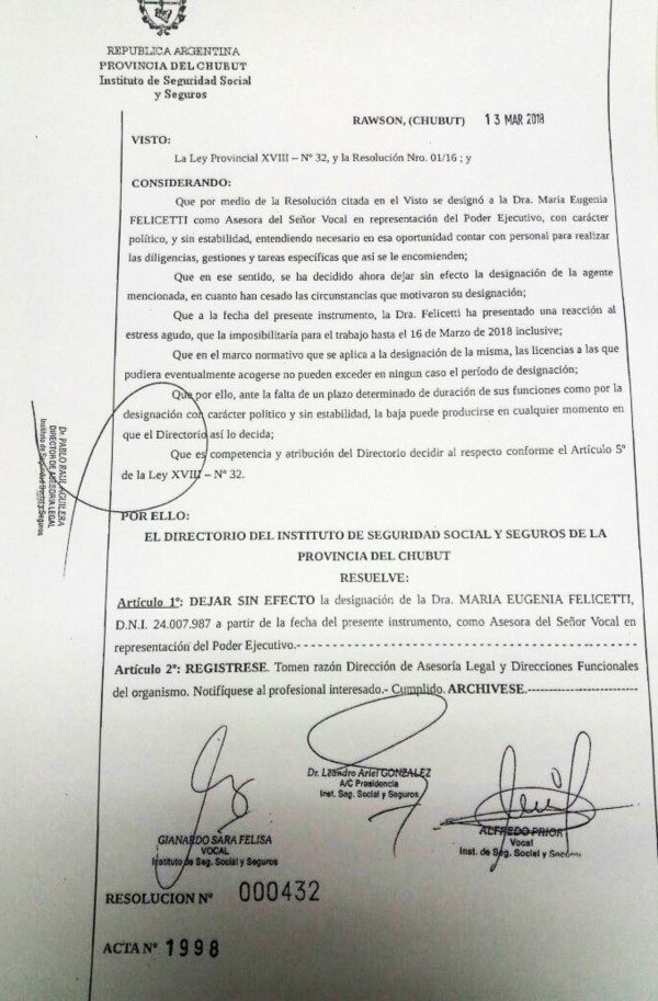 Más allá de la decisión formal de las autoridades del Instituto, también el gremio APISSyS Chubut, que agrupa a los trabajadores de la institución y de la obra social Seros, expresaron en un comunicad sus críticas contra Felicetti: