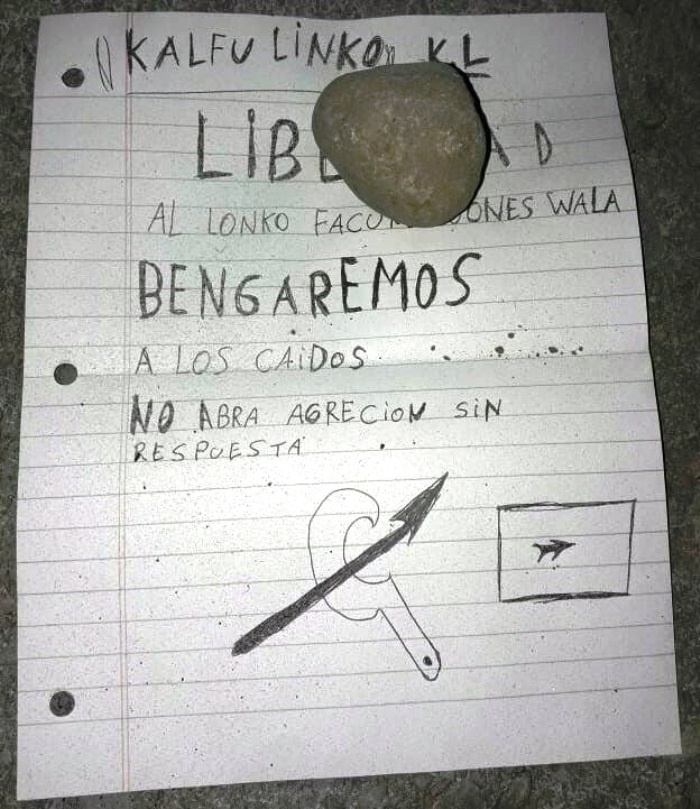 Al llegar la policía advirtió que habían dejado un panfleto que no hace directamente alusión a la Resistencia Ancestral Mapuche (RAM) reclamando la libertad de Jones Huala.