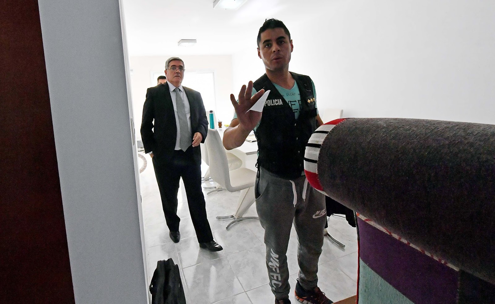El procurador Miquelarena y, detrás, los fiscales Rodríguez y Williams, durante un allanamiento en Playa Unión.