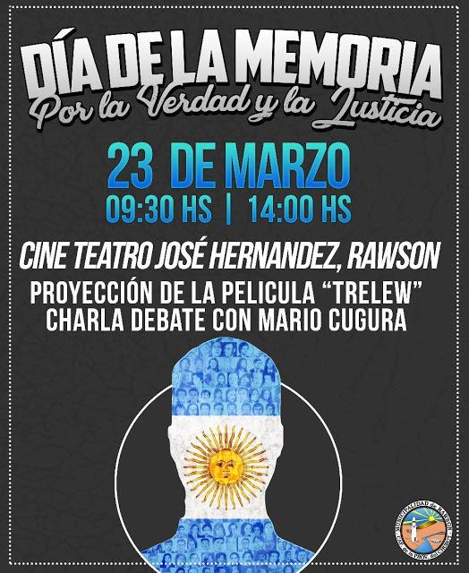 A partir de las 9.30 habrá una charla debate con Mario Cugura, miembro de la organización H.I.J.O.S, para estudiantes secundarios de los distintos establecimientos educativos de la capital provincial, se proyectará la película “Trelew”, en el Cine Teatro José Hernández.